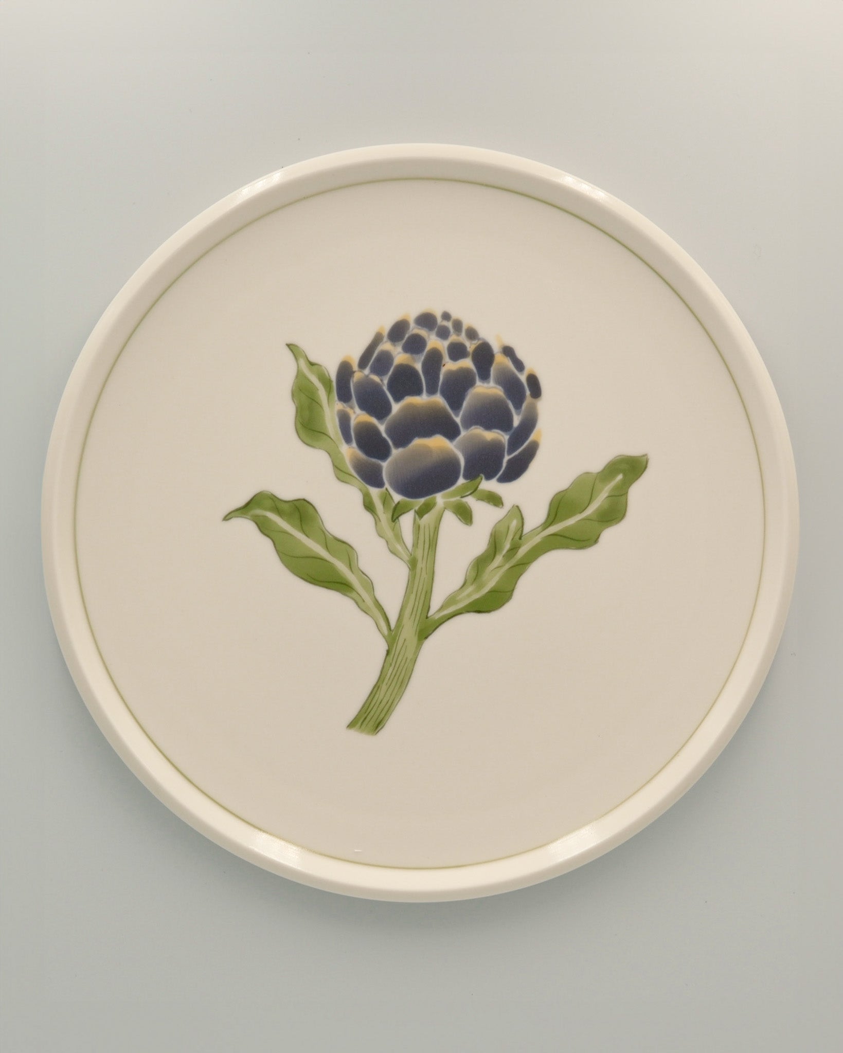 A purple artichoke with precise, layered petals and verdant green leaves over porcelain. The motif draws from classical botanical illustrations, with every brushstroke applied carefully by hand.